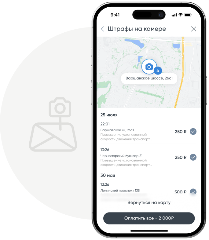 • Карта мест нарушения с полной информацией — за что и когда выписан штраф